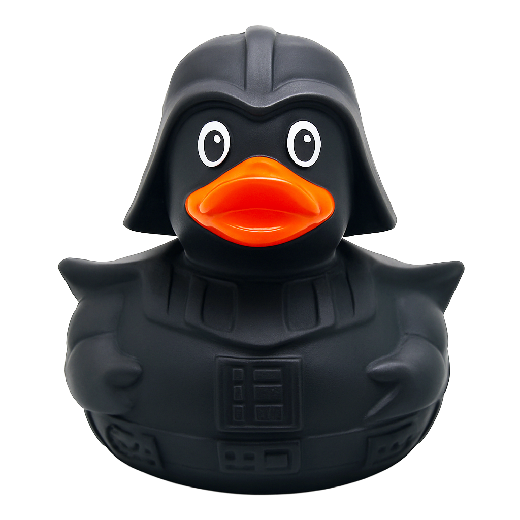 This isn’t just any rubber duck… it’s the Dark Duck! Dressed in black armor with a serious look, it’s ready to rule the galaxy