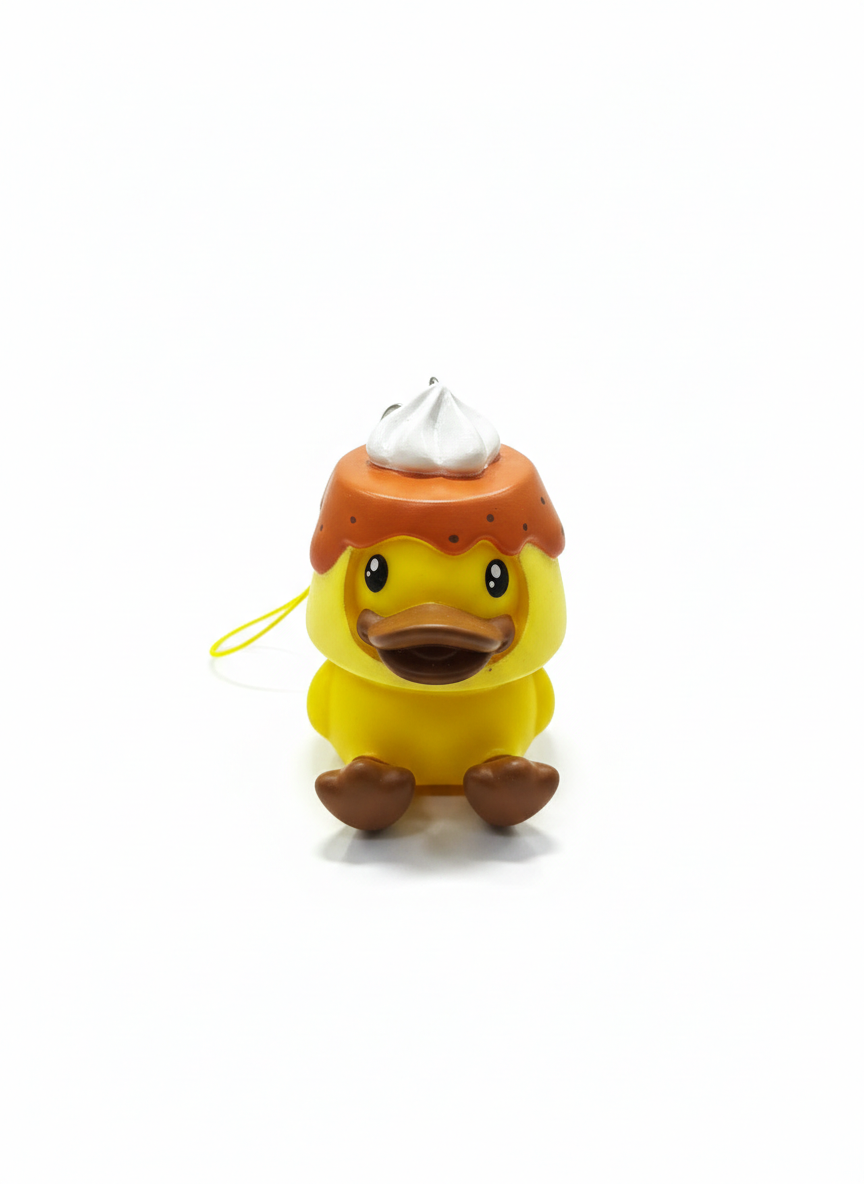 This adorable duck keychain is dressed up as a sweet caramel flan, complete with a dollop of whipped cream on its head and matching brown accents on its bill and feet.