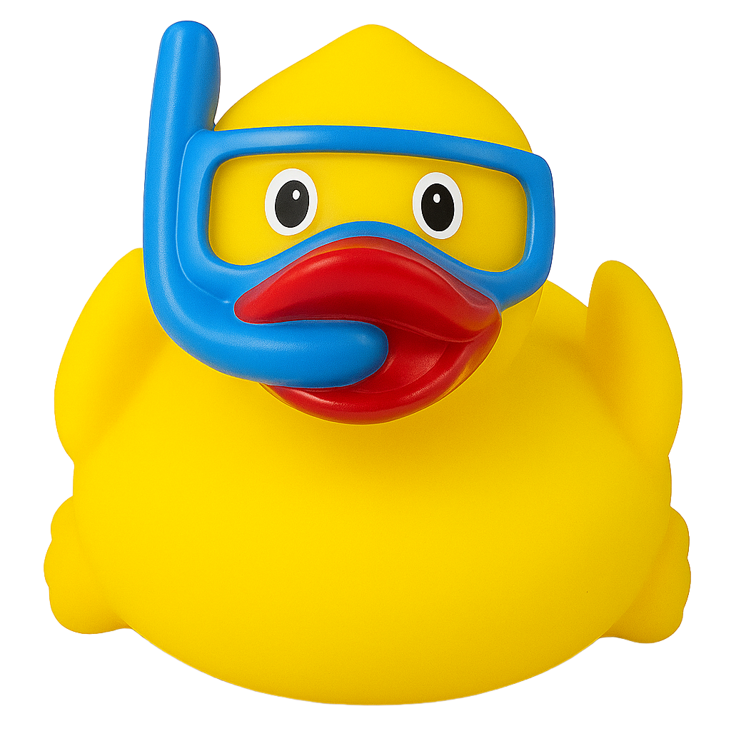 Snorkeling Duck is the adventurous explorer of the water world. With his colorful snorkel and goggles, he dives beneath the surface to discover hidden treasures, playful fish, and shimmering plants. Always curious and full of energy, Snorkeling Duck turns every swim into an underwater adventure
