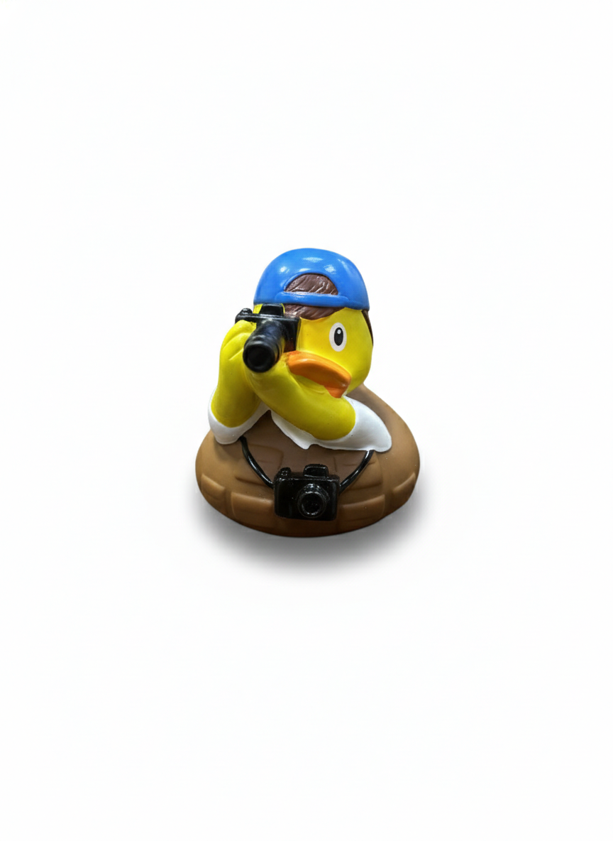 Capture the moment! This duck is ready for its close-up, featuring a stylish blue cap and a detailed DSLR camera. Whether shooting a wedding or a marketing campaign, it’s the ultimate accessory for every creative professional.