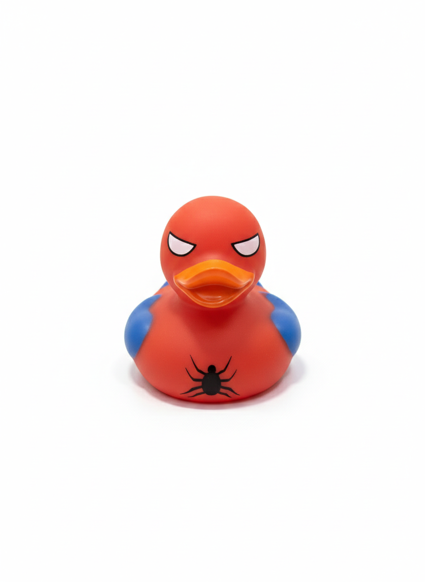Your friendly neighborhood bather! Dressed in a classic red and blue hero suit with a spider emblem and large white eyes, this duck is ready to swing into action and save the day in your collection.